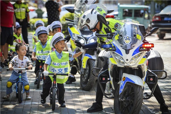 A traffic policeman reaches out to greet a young admirer dressed in his own police uniform in Taierzhuang district, Zaozhuang, Shandong province, on Sunday.