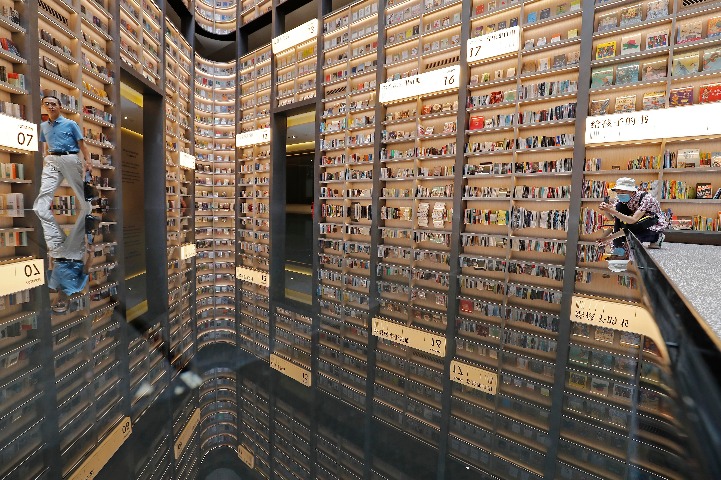 A visitor takes a photo of a bookstore and its image in a reflecting pool on the third floor of the Atour S Hotel in Minhang district, Shanghai, on Sept 1.
