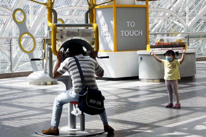 A father and child experience a "clairaudient" device at the Shenyang Science Palace, in Shenyang, capital of Liaoning province, on Sunday. The device helps people hear beyond the normal range. The palace held a science carnival as part of a national promotion week, featuring exhibitions, experiment