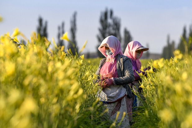The fields are in Daba village, Yanchi county, Northwest China's Ningxia Hui autonomous region, and the flower is the daylily. Planted on 320 hectares of farmland -- equivalent to 450 soccer fields -- the daylilies will be disinfected by steaming, then dried and delivered to customers for consumptio