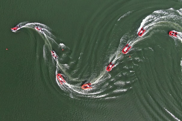 Personnel from Fujian province's fire and rescue services navigate strategically placed buoys during a flood drill in Jiangle county, Sanming city, on Tuesday.