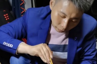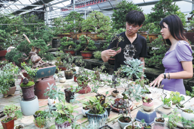 With bonsai trees of various shapes and birds chirping in the garden, Wang Guangming skillfully attaches a twig to the branch of a pine tree before covering it with some cling wrap.