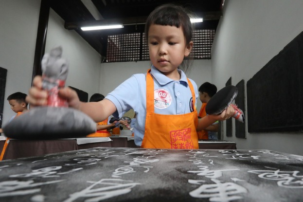 A primary school student tries out inscriptions at the Suzhou Museum of Inscribed Stone Tablets in Suzhou, East China's Jiangsu province, on July 7. Rubbings from inscribed stones are used to make "copies" of texts carved on stone tablets. More than 30 primary school students visited the museum to e