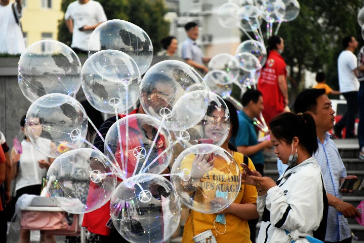 Street stands selling light-emitting balloons do good business at Lotus Square near the Huaihe River scenic belt in Jinhu county, Jiangsu province, on Tuesday.