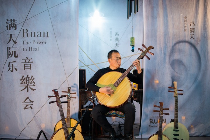 Candles are lit, incense sticks burn and percussion instruments of various sizes and shapes are lying on the table. Feng Mantian, player of the ruan, a traditional Chinese plucked, stringed instrument, sits in the center of the room, and performs along with his band members, percussionists Zhao Bing
