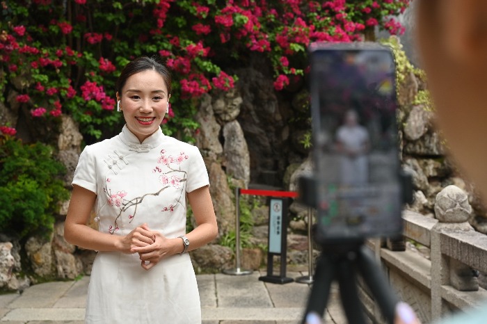 Aerial photo taken on May 19, 2020 shows staff members performing via livestreaming on a cellphone at a historical and cultural area of Fuzhou, southeast China's Fujian province.