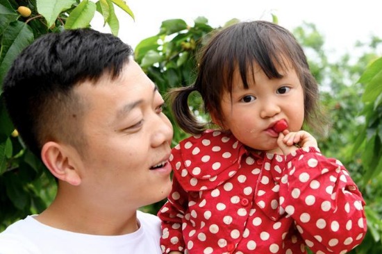 A tourist picks cherries during a cherry festival held at the Cherry Vale scenic area in Erqi District of Zhengzhou, Central China's Henan province, May 6, 2020.