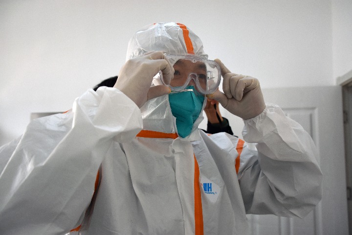 Dressed head to toe in protective clothing, Shi Xuebin climbs aboard his vehicle to transport his special passengers-patients confirmed or suspected to have been infected with COVID-19.