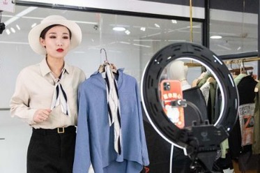 A model shows clothes by live broadcast at a clothing store of a garment market in Zhuzhou, Central China's Hunan province, March 2, 2020. A large number of clothing stores and garment merchants in Zhuzhou have joined online sales to resume work during the fight against the novel coronavirus.