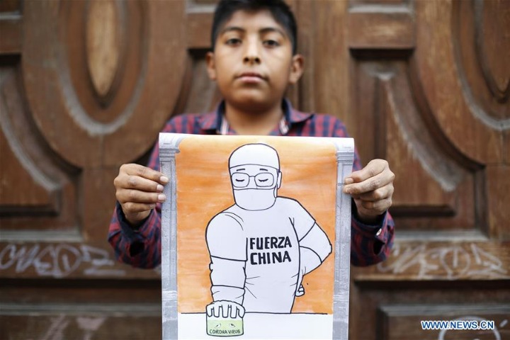 Shanti Itze, a 7-year-old Mexican girl, makes a drawing in support of China's fight against the novel coronavirus in Mexico City, Mexico, Feb. 10, 2020.