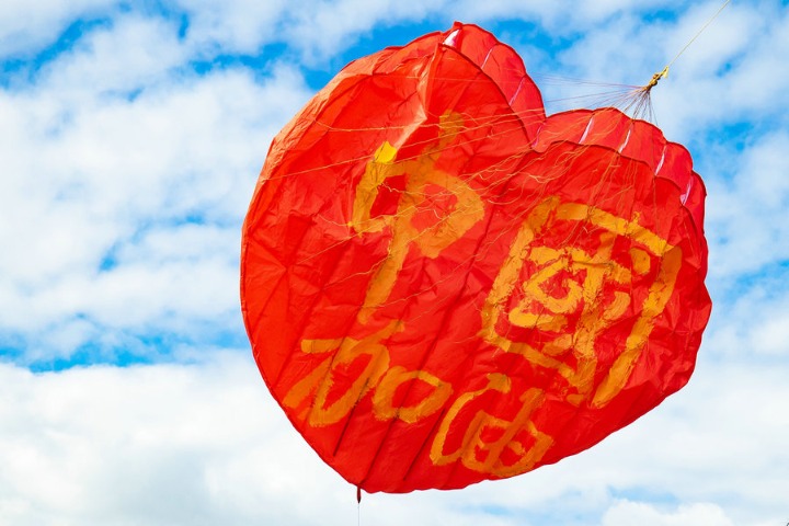 A red heart-shaped kite bearing the yellow characters “Zhongguo Jiayou”, meaning “China, stay strong” in English, stole the show at the Otaki Kite Festival, held from Feb 8-9 on the Otaki Beach in Wellington, New Zealand.