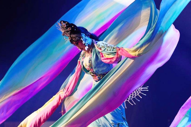 An artist from China's Wuhan City dances during a Chinese Spring Festival gala at the Liege Convention Center in Liege, Belgium, Jan 18, 2020. As the Chinese Spring Festival is approaching, performers of several art groups from China's Wuhan City came to Belgium on Jan 17 and 18, bringing performan