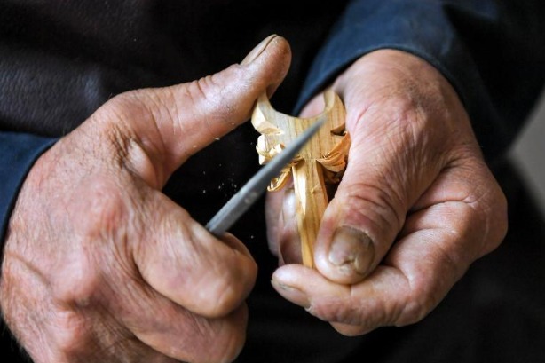 Villagers makes traditional musical instruments in his home in Tuwankewukushake village in Shufu county, Northwest China's Xinjiang Uyghur autonomous region.