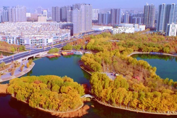 A beautiful view of Lixiang Lake, surrounded by trees with golden leaves, in Korla city, Northwest China's Xinjiang Uygur autonomous region, as temperatures continue to drop.
