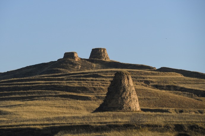 Photo taken on Oct 31, 2019 shows beacon towers of a section of the Great Wall built in Ming dynasty (1368-1644) in Qingshuihe county, Hohhot, capital of North China's Inner Mongolia autonomous region.