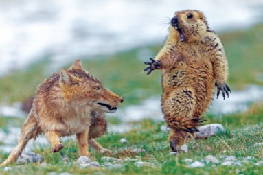 "Yikes!"-that's the first thing that came to my mind when I saw the award-winning photo by China's Bao Yongqing, who took a shot of a marmot jumping in fright as a Tibetan fox sneaked up behind it.