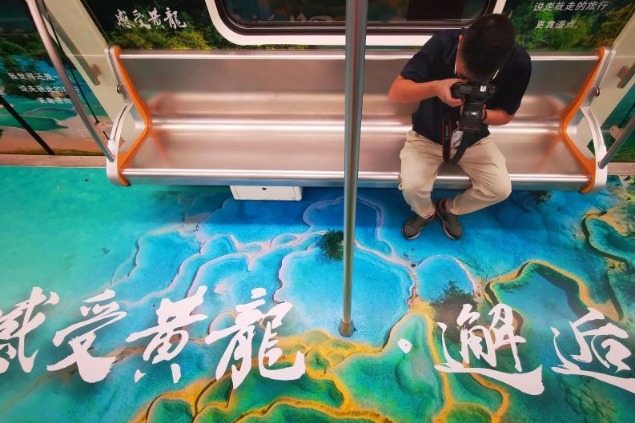 A Chengdu Metro train with an interior featuring the Huanglong Scenic and Historic Interest Area is seen in Chengdu city, Sichuan province, Sept 9, 2019.