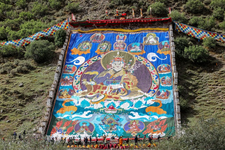 In a studio on the top floor of a three-story Tibetan-style house in Lhasa, capital of Southwest China's Tibet autonomous region, Phuntsok Tobgye and his apprentices are busy working on a thangka painting, measuring more than 10 meters in length and nearly three meters in width.