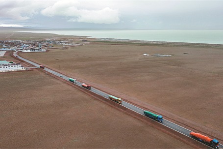 Climbing over the high mountains, passing the blue lake below, the buses seem connected as they negotiated the winding plateau highway.