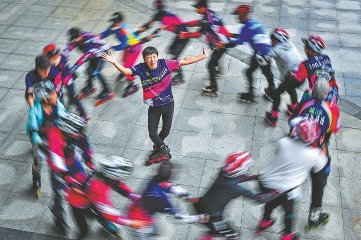 A group of elderly roller skating enthusiasts in Wuhan enjoy roller skating.
