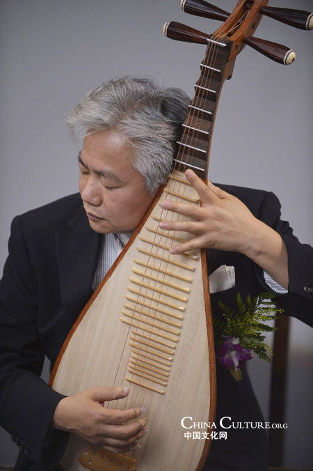 Fang Jinlong, vice-president of the Asian Artist League, plays Pipa at the opening ceremony of the exhibition on May 4 in Beijing.[Photo/chinaculture.org]