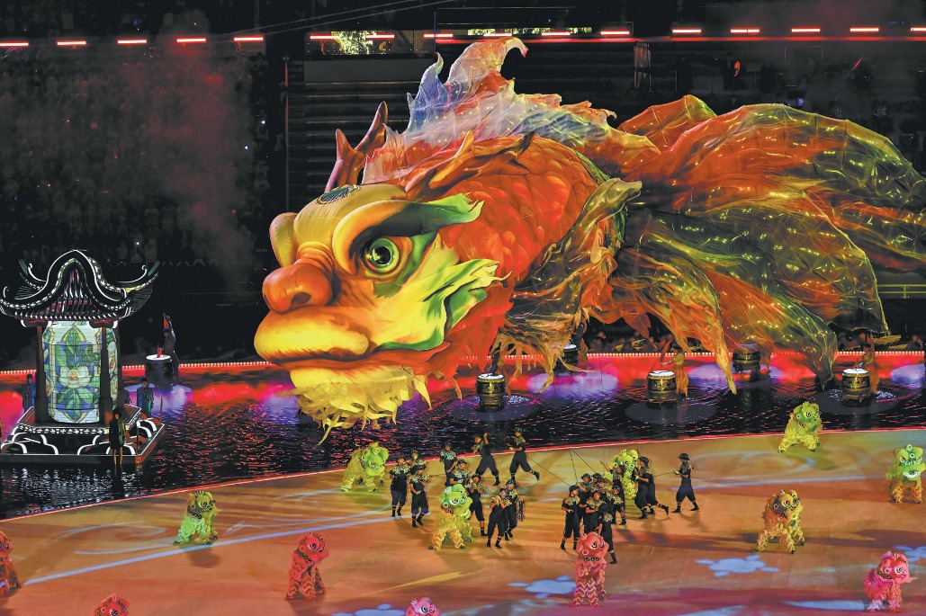 A colossal, multicolored lantern floated effortlessly into the Guangdong Olympic Sports Center, its dragon head fierce and eyes bold, fins flowing like waves. It was Aoyu — a legendary mythical creature with the head of a dragon and the body of a fish — brought vividly to life.