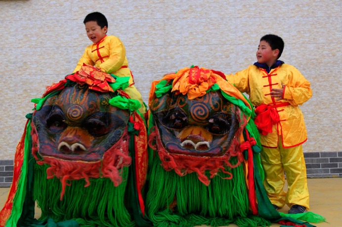 Two brightly colored lions prance in, blinking their formidable eyes and deftly hopping onto poles to the lively beating of drums and ringing of bells.