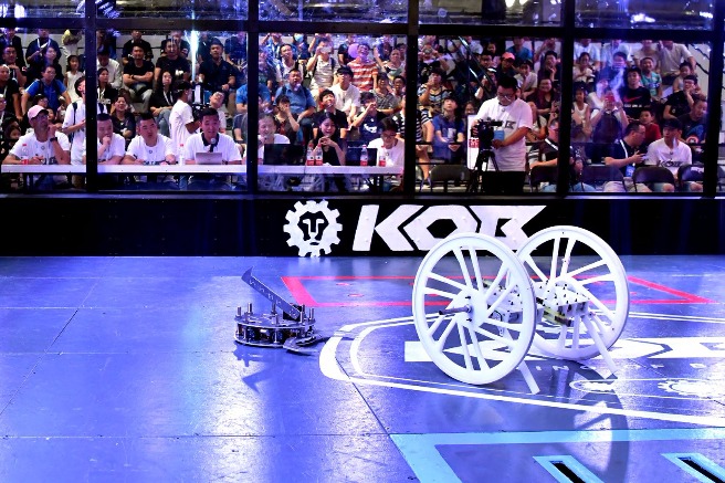 With lights flashing and rock music booming, two iron boxers smash, pummel and slash at each other as sparks and robot parts fly in the arena.