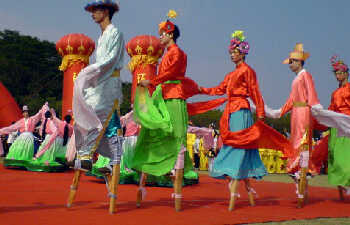 踩高跷是民间盛行的一种群众性技艺表演。高跷本属我国古代百戏之一种,早在春秋时已经出现。我国最早介绍高跷的是《列子o说符》篇:"宋有兰子者,以技干宋元。宋元召而使见其技。以双枝长倍其身,属其胫,并趋并驰,弄七剑迭而跃之,五剑常在空中,元君大惊,立赐金帛。"从文中可知,早在公元前五百多年,高跷就已流行。表演者不但以长木缚于足行走,还能跳跃和舞剑,高跷分高跷、中跷和跑跷三种,最高者一丈多。据古籍中记载,古代的高跷皆属木制,在刨好的木棒中部做一支撑点,以便放脚,然后再用绳索缚于腿部。表演者脚踩高跷,可以作舞剑、劈叉、跳凳、过桌子、扭秧歌等动作。北方的高跷秧歌中,扮演的人物有渔翁、媒婆、傻公子、小二哥、道姑、和尚等。表演者扮相滑稽,能唤起观众的极大兴趣。南方的高跷,扮演的多是戏曲中的角色,关公、张飞、吕洞宾、何仙姑、张生、红娘、济公、神仙、小丑皆有。他们边演边唱,生动活泼,逗笑取乐,如履平地。据说踩高跷这种形式,原来是古代人为了采集树上的野果为食,给自己的腿上绑两根长棍而发展起来的一种跷技活动。