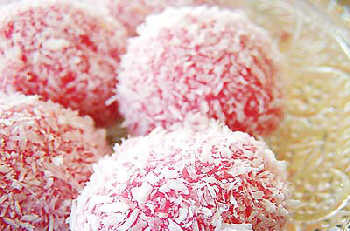 擂沙甜汤圆:这汤圆蕴含着南方乡土的传统,旧时是先用一只内壁带有梭形纹路的缸瓦土沙盆,再用一支质地坚硬的石榴木作为磨粉浆的"擂浆棍",往沙盆中放入炒香的干豆,如花生、芝麻或黄豆,干磨出碎末粉状的"香沙";最后,煮熟的汤圆在"香沙"里滚来滚去,于是粘粘的糯米丸子黏满了盈香扑鼻的"香沙",故名为擂沙汤圆。此丸子说来应属于"无水糯米丸子",因丸子中一般会有麻蓉或花生蓉馅料,所以老百姓也就不去讲究有水或无水之分,都一概称之为"汤圆"。