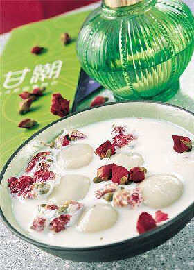 单看外型已够赏心悦目,吃一口,更有双唇在浸玫瑰花浴的感觉,椰汁、鲜奶再加玫瑰花,清润而暖和,再加上同样有美颜作用的芝麻汤圆,最适合女孩子品尝。