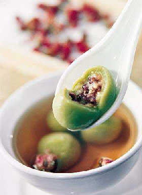 菠菜做馅的汤圆也不一定是碱的,因为菠菜内加入砂糖及花生,却依然有淡淡菜味,吃起来特别清,也适合大鱼大肉之后食用。