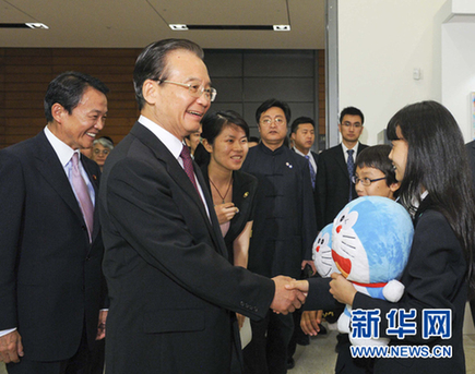 6月8日,中日合办影视周、动漫节在北京国家博物馆启动。国务院总理温家宝与日本首相特使、前首相麻生太郎出席启动仪式,并同两国少年儿童和影视、动漫工作者一起参观展览。这是温家宝同前来参加活动的日本小朋友亲切握手。新华社记者 饶爱民 摄