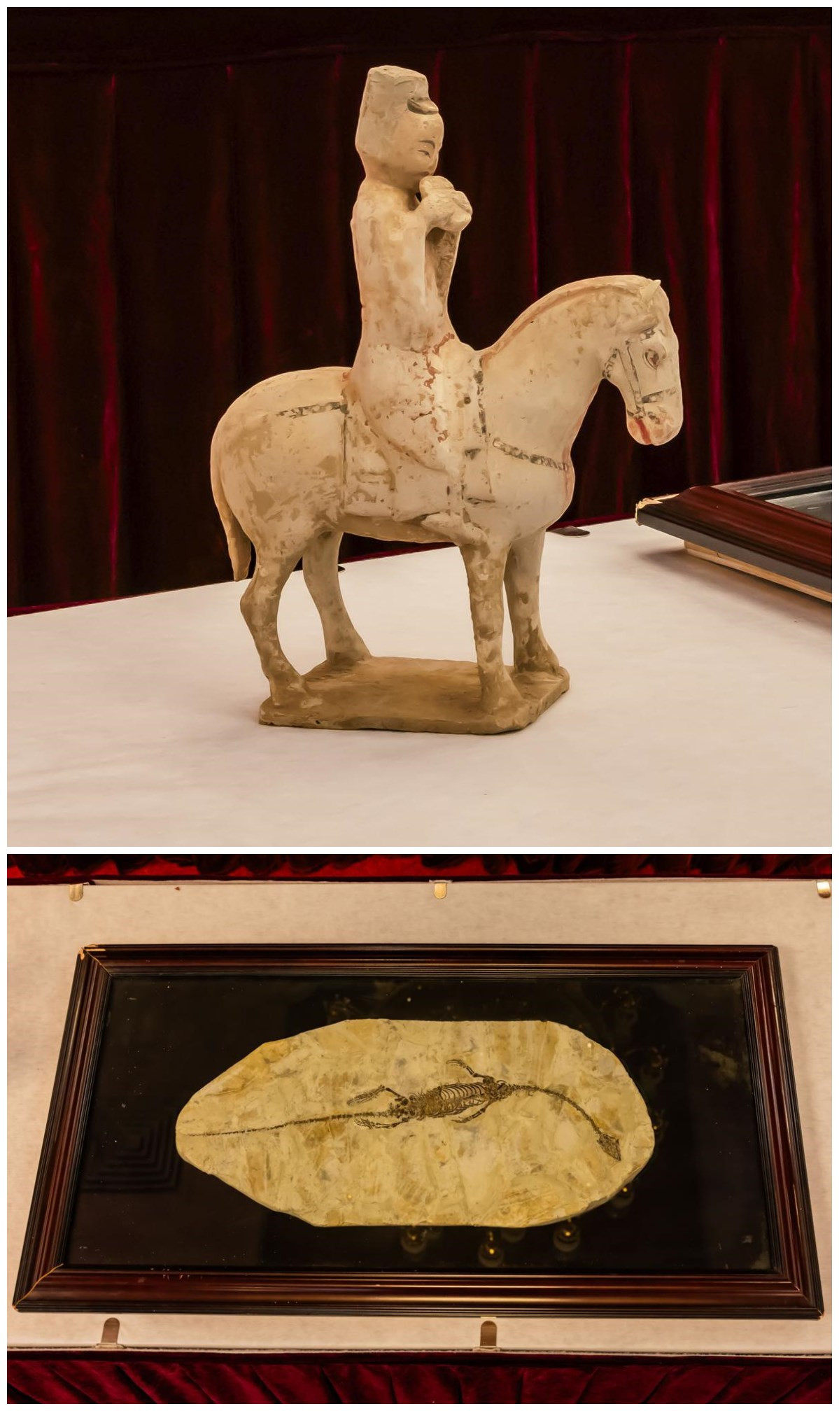 The items included a ceramic figure of a person riding a horse, a gilded bronze Buddhist statue that can be traced back to the Tang Dynasty (618-907) or the Northern Dynasty (386-581), and a dinosaur fossil dating back to the late Jurassic or early Cretaceous period.