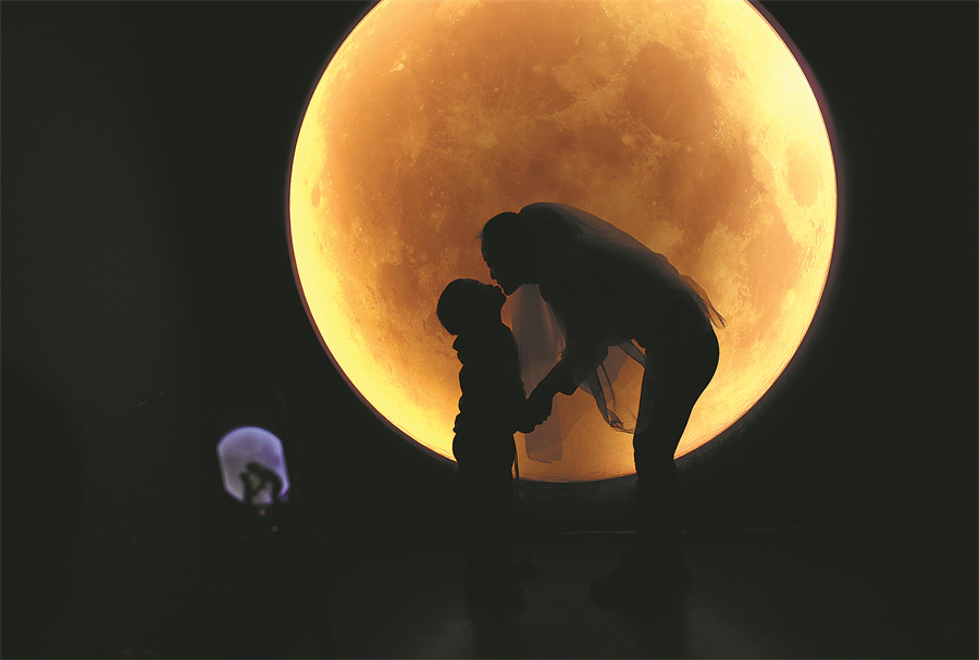 A mother and child pose for a picture at an art stadium in Beijing on Feb 11.[Photo provided by Zou Hong/China Daily]