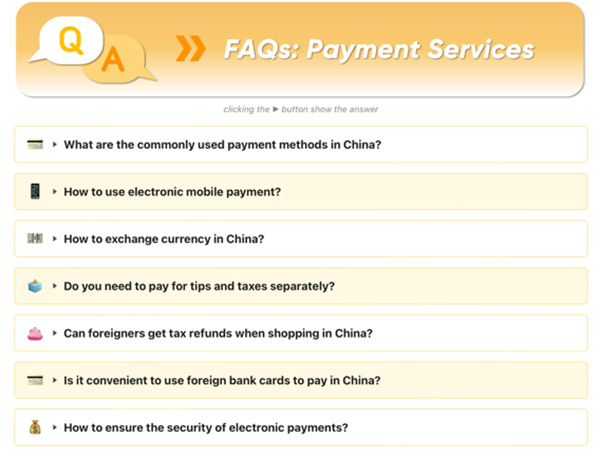Wondering if you'll need cash? The "Payment" section introduces popular online options such as WeChat Pay and Alipay, enabling easy payments from street food stalls to major shopping centers.