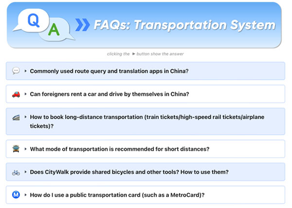 Want a city walk? The "Transportation" section organizes key information on using the metro, hiring taxis, renting cars and riding shared bikes.