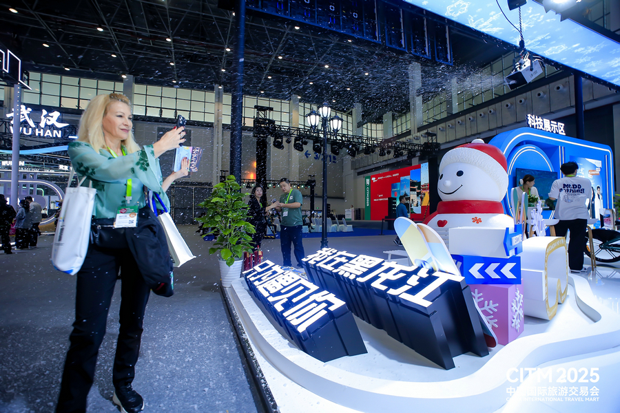 An international travel agent takes photos of the snowman on display at the exhibition area of Northeast China’s Heilongjiang province, part of the China International Travel Mart 2025, in Haikou, Hainan province, on Dec 19. [Photo provided to chinadaily.com.cn]