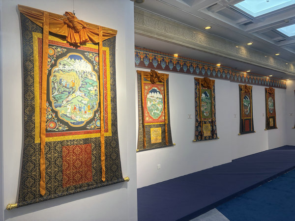 Beautiful thangka paintings are on show at the Cultural Palace of Nationalities in Beijing celebrating cultural depth and social developments. [Photo by Lin Qi/chinadaily.com.cn]