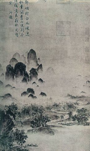 据说赵佶曾作山水画《奇峰散绮图》,“意匠天成,工夺造化,妙外之趣,咫尺千里。其晴峦叠秀,则阆风群玉也;明霞纾彩,则天汉银潢也;飞观倚空,则仙人楼居也;至于祥光瑞气,浮动于缥缈空明之间,使览者欲跨汗漫,登蓬瀛,飘飘焉,若投六合而隘九州也”。(邓椿《画继》)惜原作已不传。不过,现存的《雪江归棹图》卷对以上的文字记载作了最形象的诠释,并且真实地展示出赵佶山水画的本来面目。