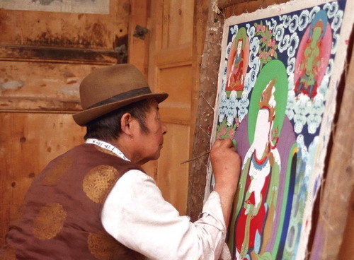 绘画唐卡,是唐卡艺术的一种最主要表现形式,它形成的流派最多,数量在各类唐卡中占绝大多数。绘画唐卡的制作主要分为画布制作、打线素描、制作胶泥凸纹、上色、染色、彩笔勾描、描金、铺金、磨色和开眼等许多复杂工序和步骤,要学习和掌握这些技能,必须有师傅的言传身教和弟子的刻苦学习揣摩。