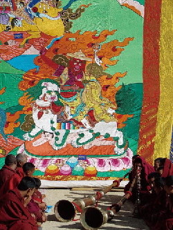 如果谁家里需要供奉一幅唐卡,首先要请活佛占卦,活佛根据主人的生辰八字卦出应供奉的佛,菩萨或本尊作为该家的主尊以及天界地界应供奉的其他佛、菩萨。主人根据活佛所卦出的内容请画师绘制,画师在绘制过程中也要严格按照仪轨要求进行。