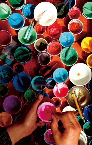 唐卡画师的颜料箱子,一切色彩都是鲜活的。