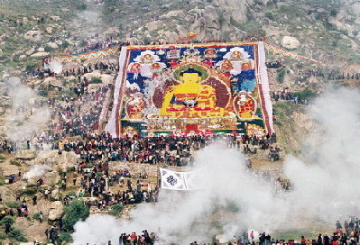 最小的唐卡仅有巴掌般大小,画在纸上、布上或羊皮上;而大的唐卡可达几十甚至上百平方米,每年择吉日而向广大信众示现,当其缓缓展开后,竟能遮住整整一面山坡!每年的八月份,西藏很多寺院都要举行盛大的佛像开光活动。西藏人叫做“展佛”,也称“晒佛”。展佛的第一天也就是西藏的雪顿节的开始。随着不断展开的释迦牟尼佛像,人们会惊喜的看到雪域高原上最大的唐卡。