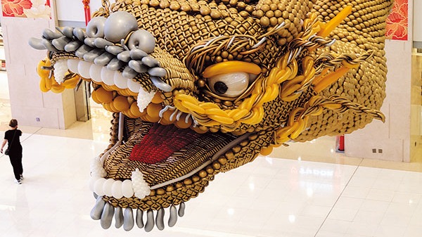 During Chinese New Year, a balloon loong (the Chinese pronunciation of dragon) measuring over 40 meters in length glided through the three-story atrium of a shopping mall in Tuen Mun, Hong Kong.